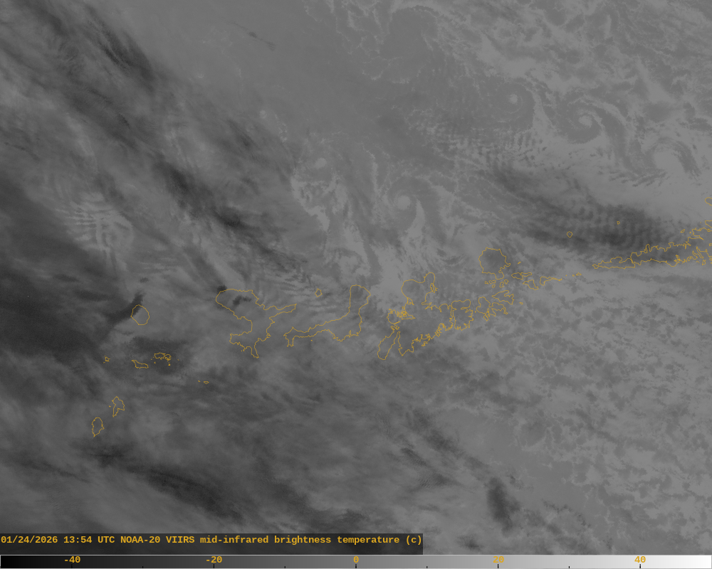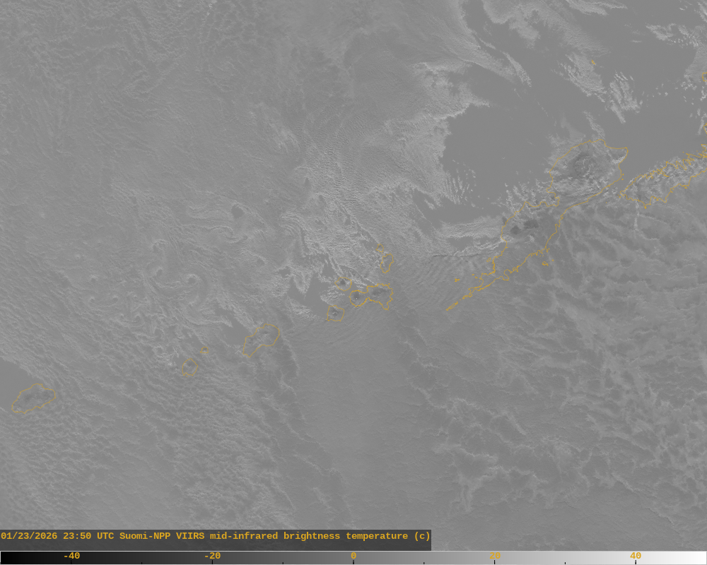 Weakly elevated surface temperatures observed in VIIRS data at known active lava flow location at Great Sitkin summit.