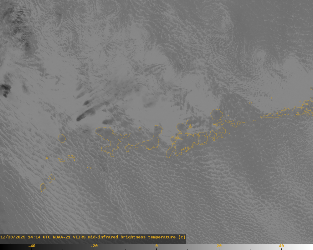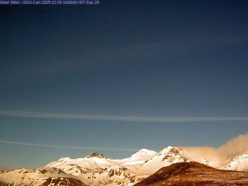 Great Sitkin (ORANGE/WATCH): Weakly elevated surface temperatures observed in VIIRS satellite imagery. Nothing unusual observed in clear webcam views. Attaching view from GSCK here to show first clear glimpse of lava flow from that angle in a long time.