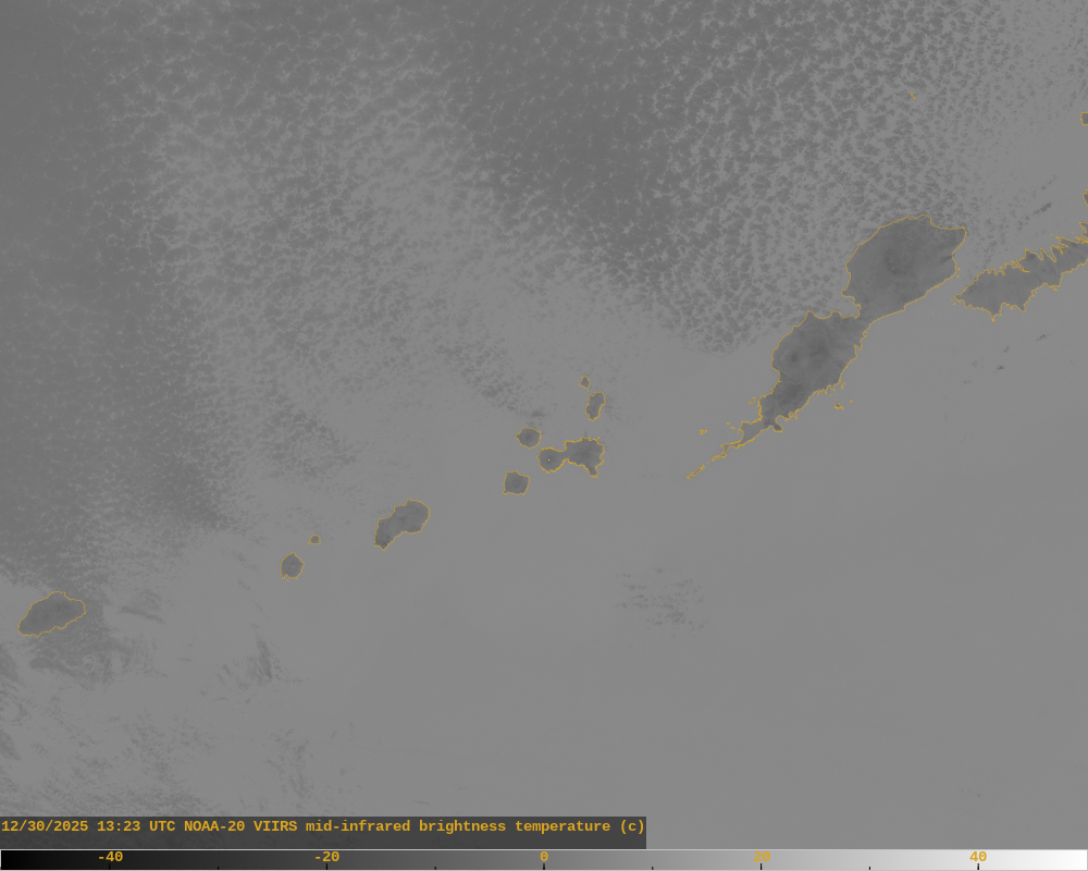 Atka volcanic complex (GREEN/NORMAL): moderately elevated surface temperatures in VIIRS imagery from known summit lake location.