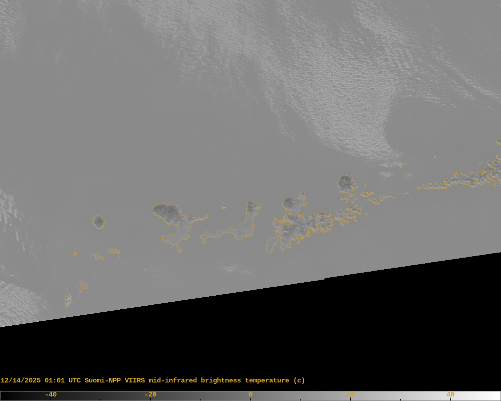 Great Sitkin (ORANGE/WATCH): Slightly elevated surface temperatures observed in several VIIRS MIR images over the past day (example attached). Clear web camera views of the volcano show nothing noteworthy. Nothing was observed in TROPOMI and VIIRS SO2 imagery.