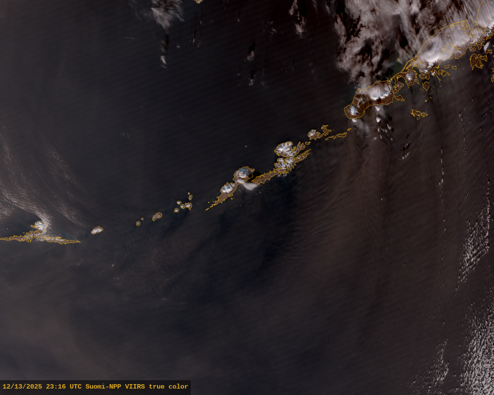 Shishaldin (YELLOW/ADVISORY): Nothing significant observed in clear satellite views of the volcano over the past day. Clear web camera views show vapor emissions at the summit. Strong northerly winds are entraining loose fine material from snow free areas and are producing some impressive dust plumes south of Unimak Island and the Alaska Peninsula (see attached example).