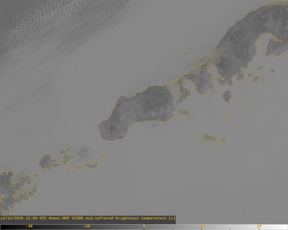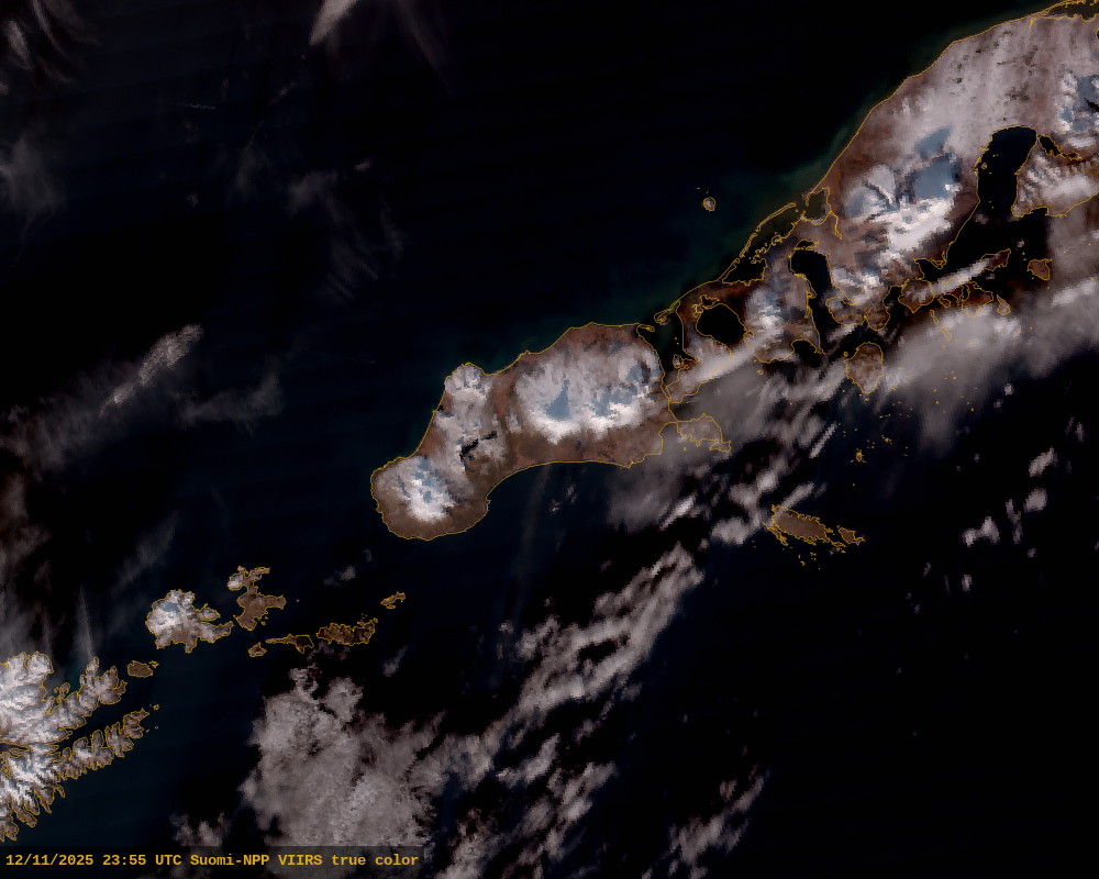 Shishaldin (YELLOW/ADVISORY): Faint, diffuse vapor plume observed in Suomi VIIRS true color image from 11 Dec 2025 23:55 UTC (attached). Possible very faint and small thermal signal at the summit. Probably a warm crater/gasses and just the right look angle producing the signal (attached).