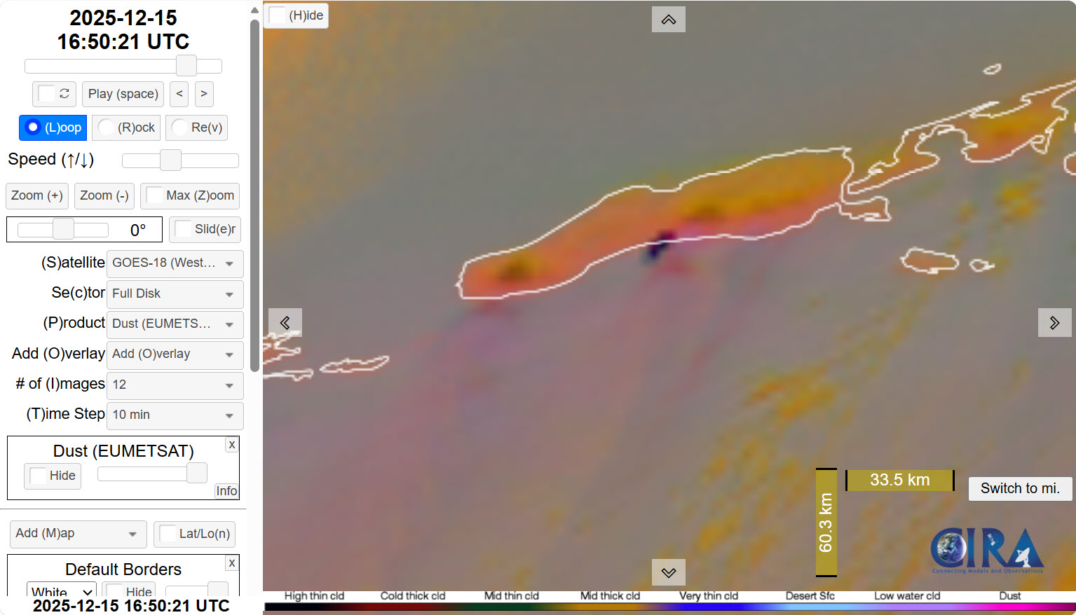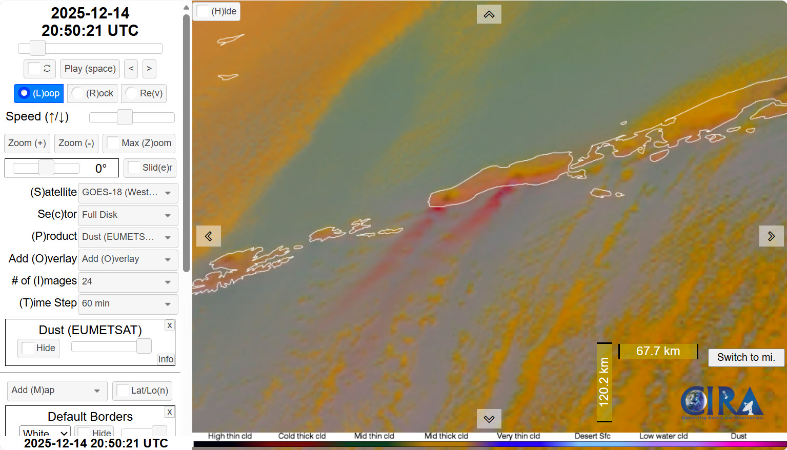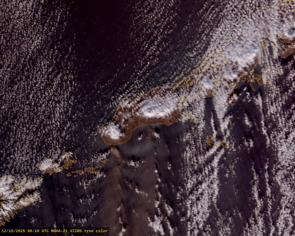 Great Sitkin (ORANGE/WATCH): A thermal anomaly was visible in multiple clear VIIRS mid-IR images over the past 24 hours (see attached example). Only two webcam images from GSCK in Ashcam, but one was a nice clear view the steamy dome. It's a nice one to use the Ashcam slider on for comparison showing dome growth over the past 2-1/2 years.