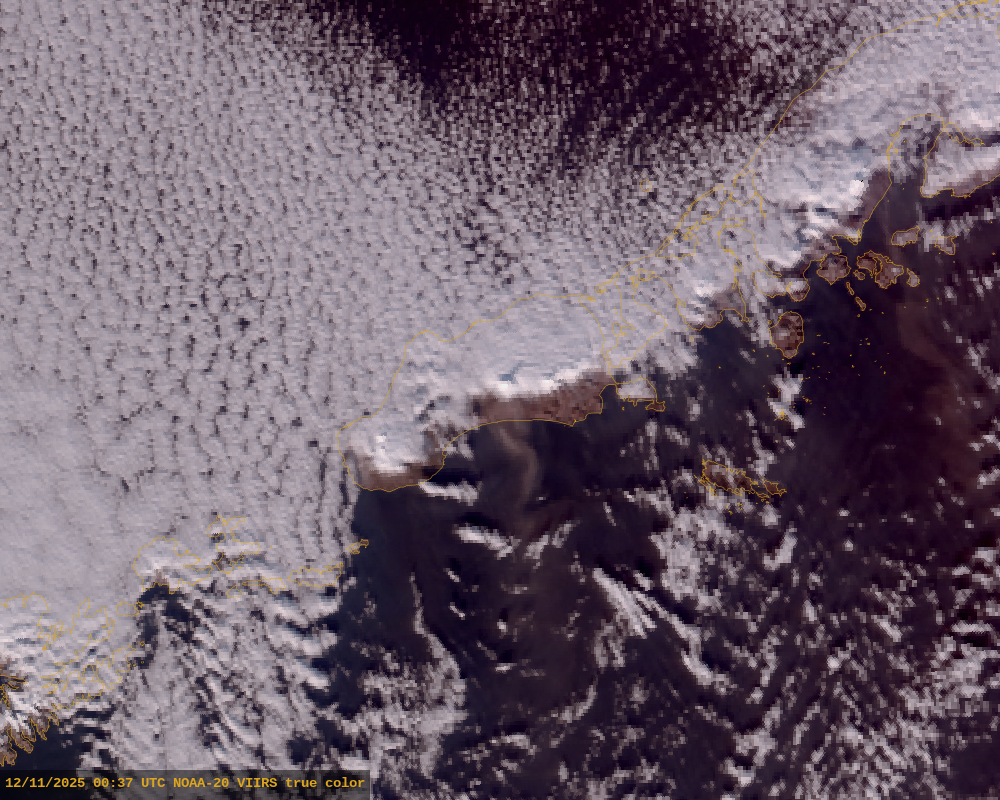 Shishaldin (YELLOW/ADVISORY): Diffuse vapor plume drifting south observed in NOAA-20 VIIRS true color image from 11 Dec 2025 00:37 UTC (attached). Minor vapor plume observed at summit in several web camera views.